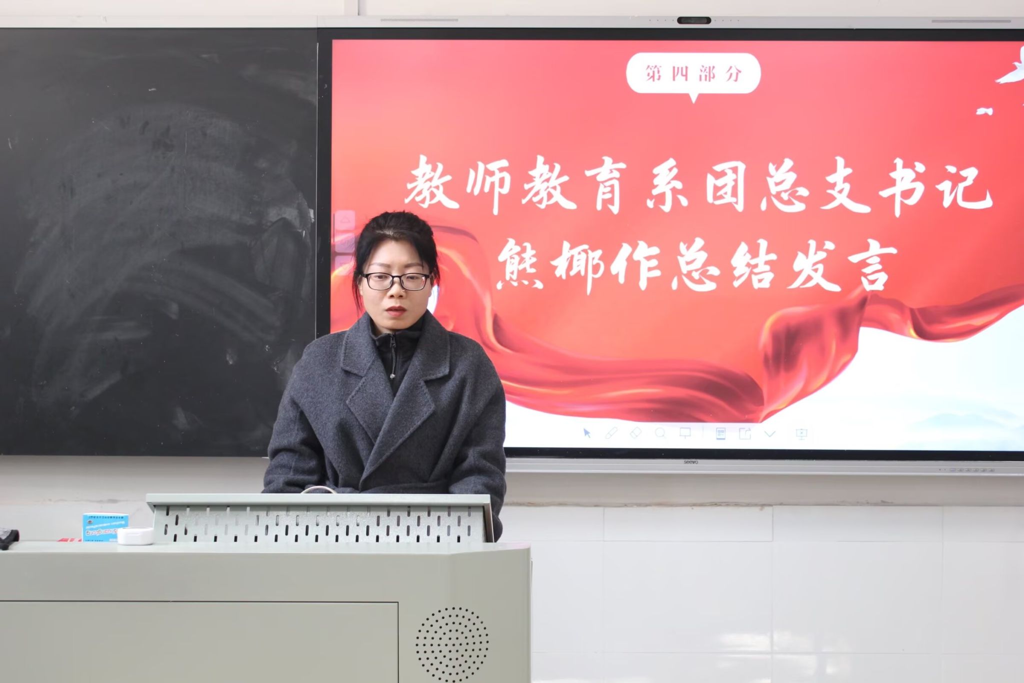 团总支学生副书记宋沁怡作团总支工作总结汇报。她对在本学期工作中提供帮助的老师表示感谢,对各部门取得的成绩表示肯定。她指出,团学全体成员要学会归纳总结,常做反思,坚定理想和信念,锐意进取,开拓创新,将团总支建设为组织信赖,同学满意的学生组织。