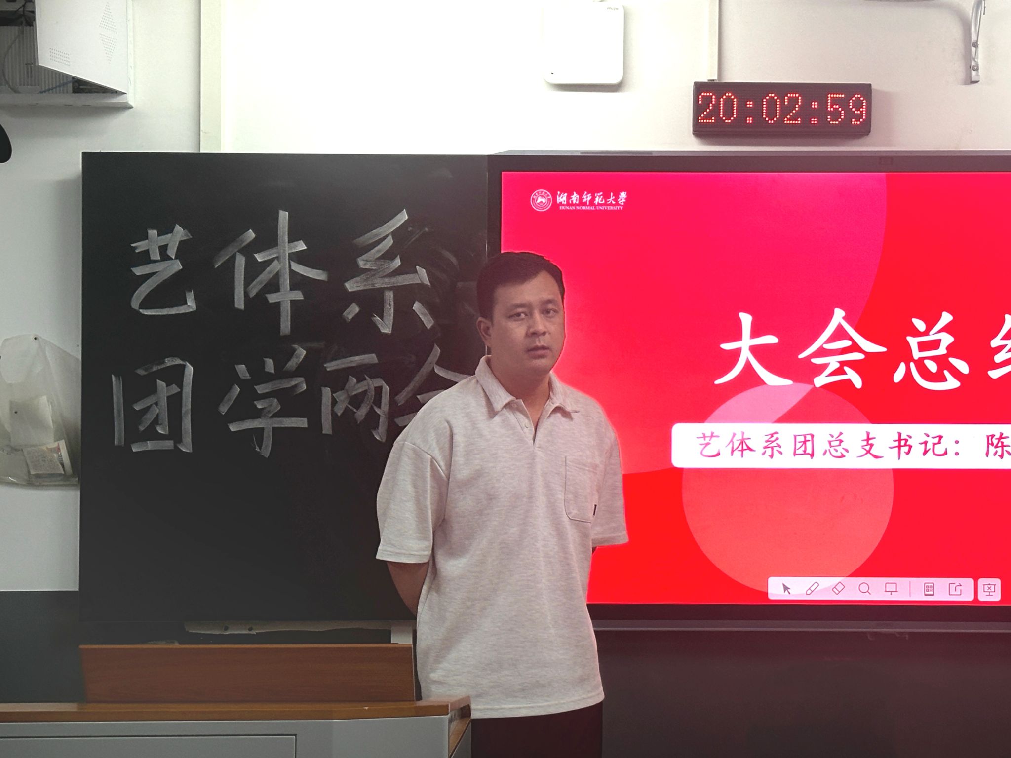 陈文鹏作总结发言。他对各部门成员过去一年的工作表示肯定。他表示,艺体系团学两会所取得的成功离不开全体成员的辛勤付出。他希望全体学生干部在今后的学习和生活中能发挥先锋模范作用,不忘初心,勇于担当,敢于创新,为艺体系团学两会的繁荣发展贡献自己的力量。