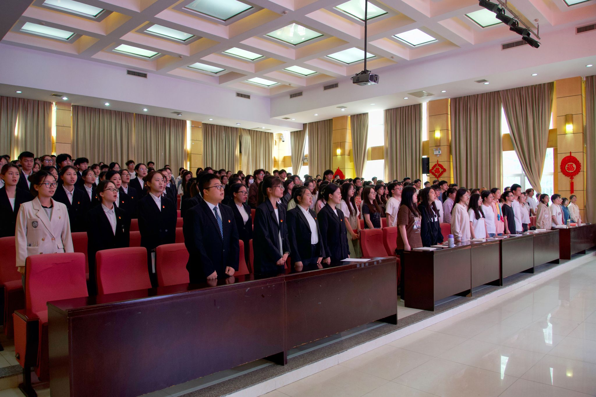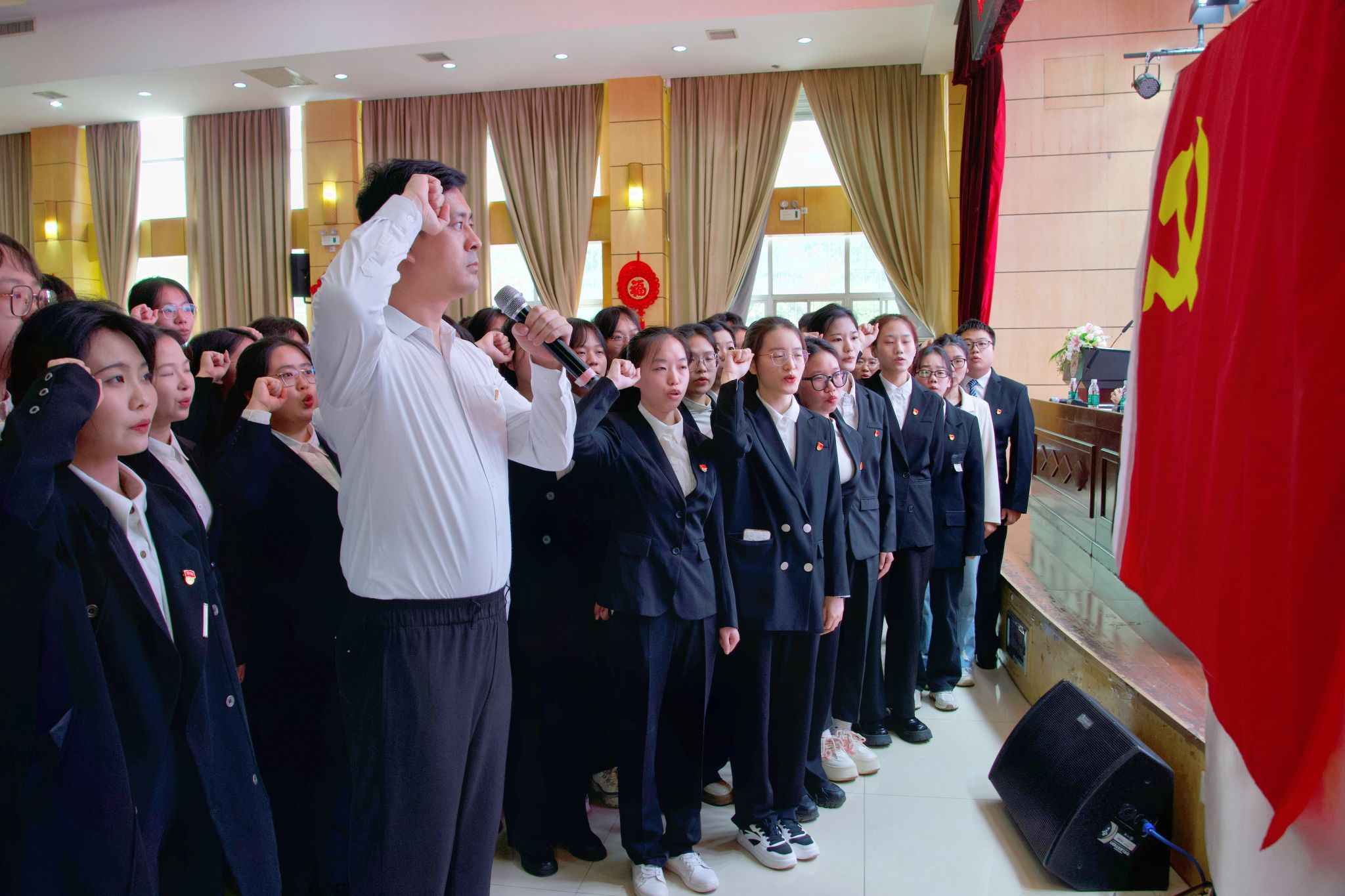 面向鲜红的党旗,艺体系学生第一党支部第一书记陈文鹏领誓,85名新党员进行集体庄严宣誓。