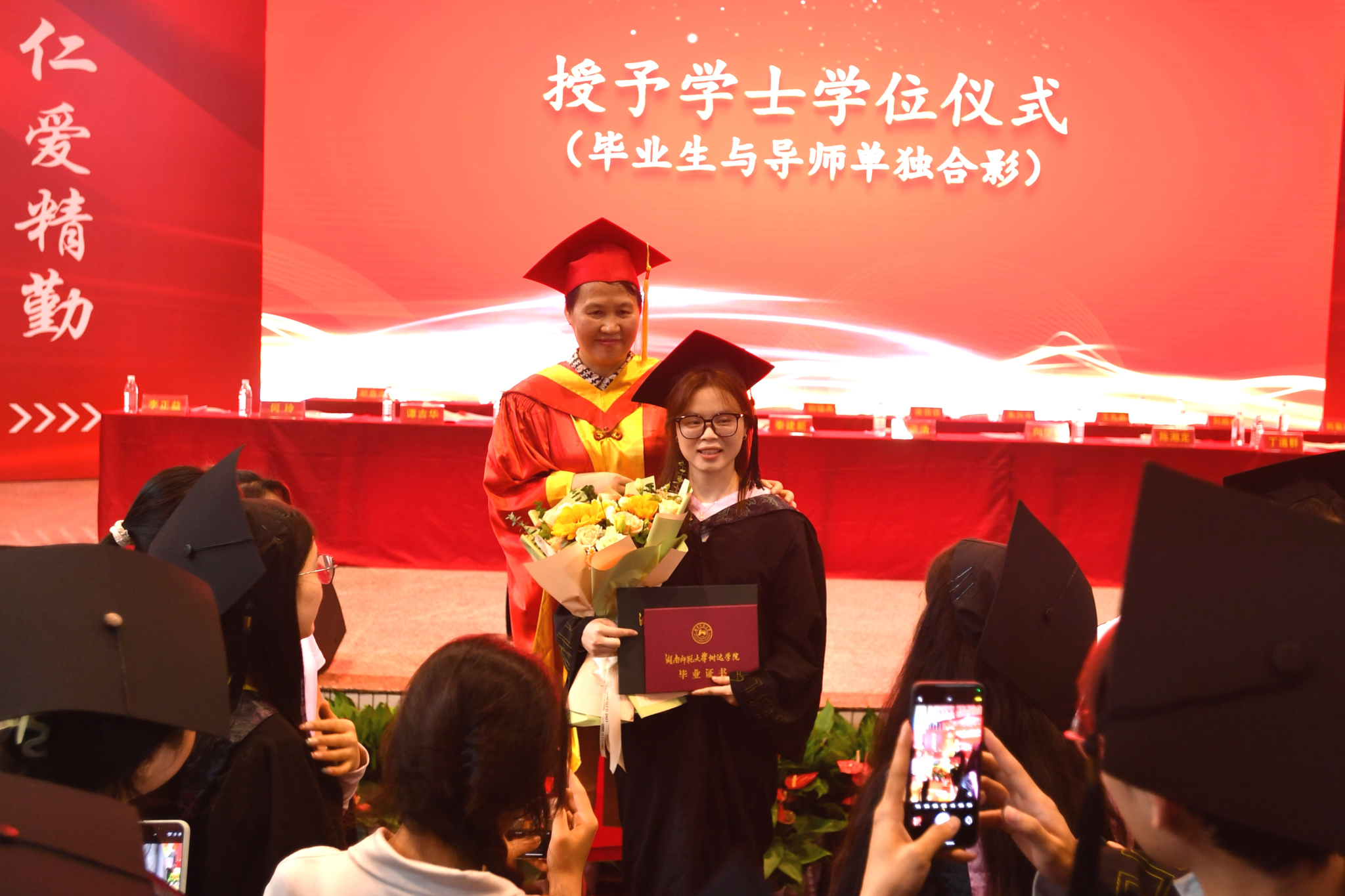 各导师为毕业生正冠拨穗,并颁发毕业证书、学位证书。