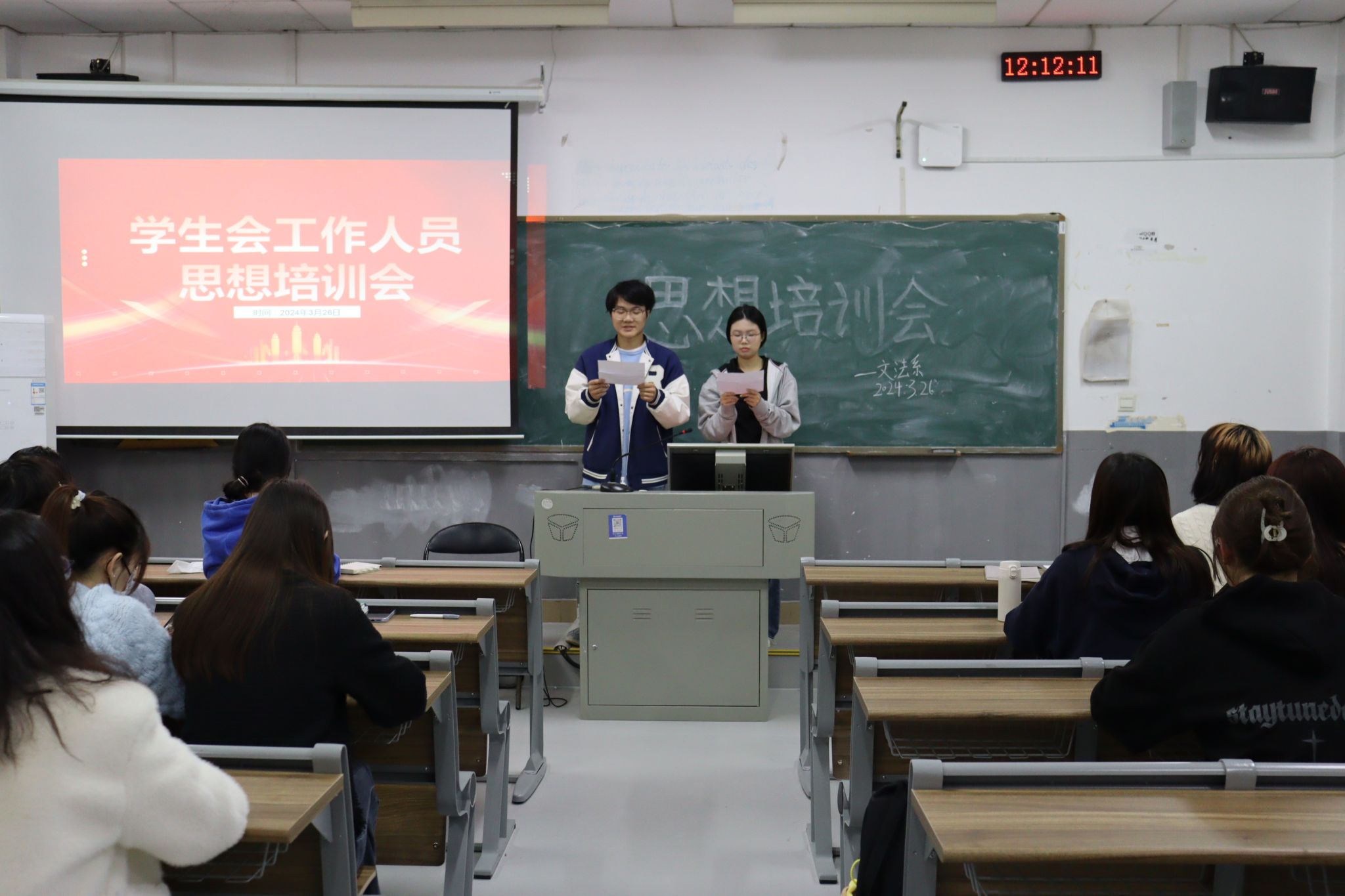 (记者 庄子轩 黄海媚 蒋谷萍)3月26日中午,我院文法系学生会在树达楼503教室召开2024年春季思想培训会。会议由文法系学生会办公室成员庄子轩、黄海媚主持。