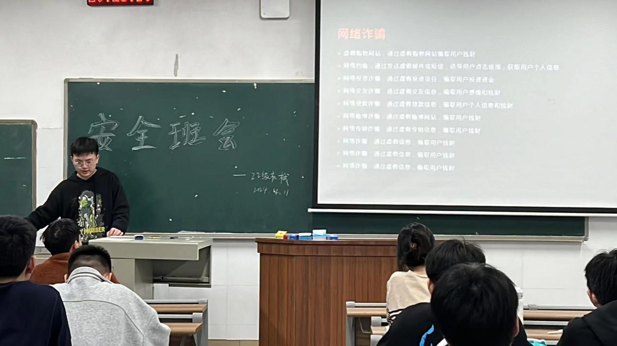 刘伟组织全体同学观看防网络诈骗视频,并从“防诈骗的重要性”、“常见的诈骗手段”、“网络安全与个人信息保护”三方面作了详细介绍。他表示,同学们应提高防范意识,时刻关注网络安全问题,学会自我保护,谨慎交友。