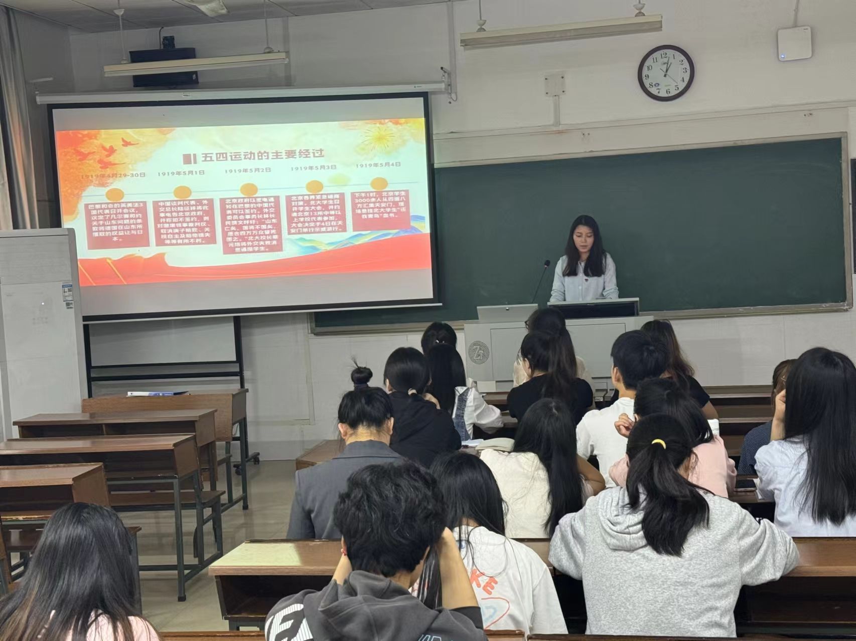 义莲从五四青年节的来历、五四精神的具体内容内涵、学习五四精神的意义、如何继续弘扬五四精神、争先绽放五四精神五个方面进行深入阐述。她表示,五四运动是一场彻底的反对帝国主义和封建主义的爱国运动,是中国新民主主义革命的开端,它孕育了以爱国、进步、民主、科学为主要内容的伟大五四精神,其核心是爱国主义精神,爱国主义精神是我们民族精神的核心,是中华民族团结奋斗、自强不息的精神纽带。