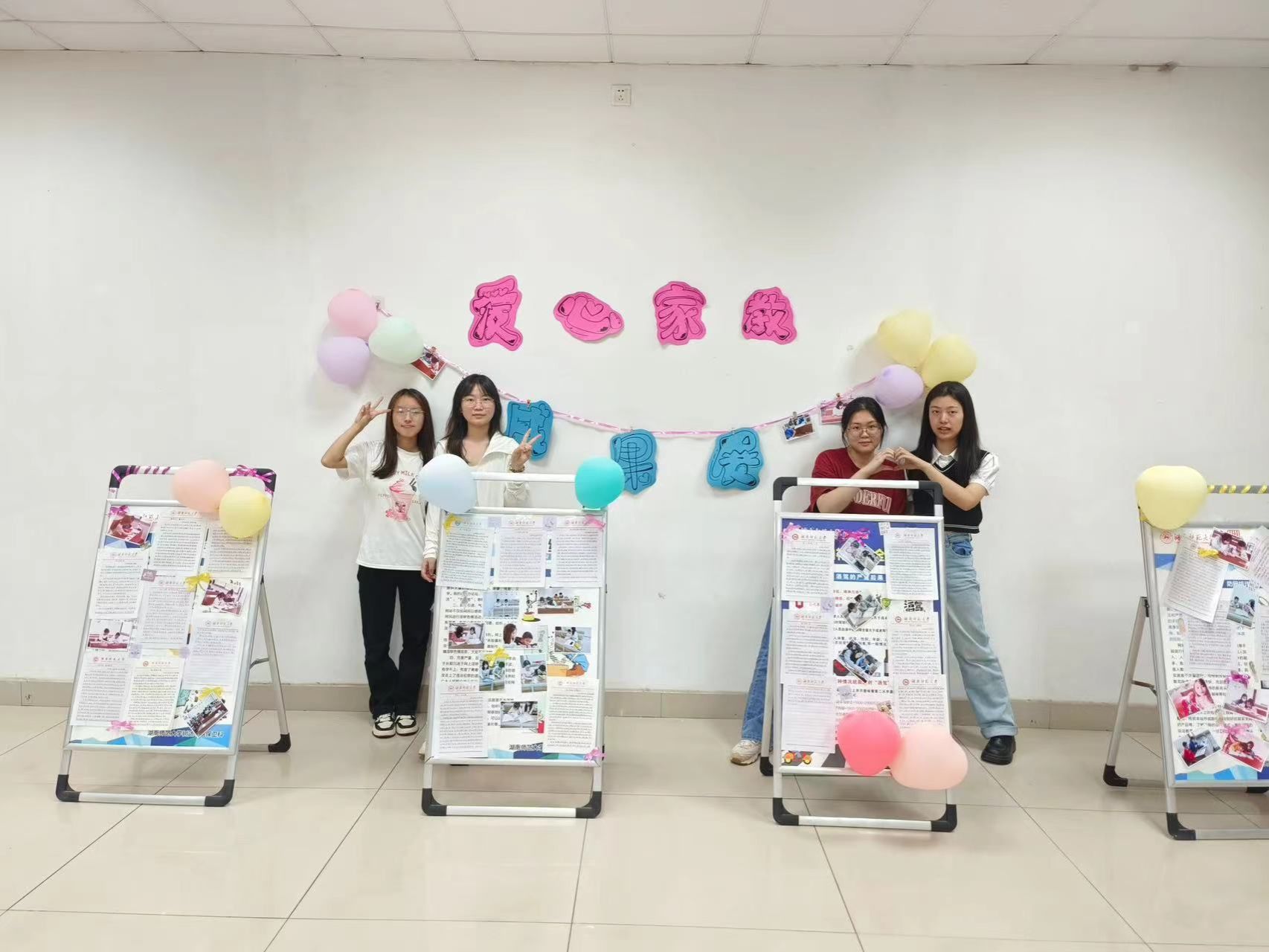 青年志愿者工作部副部长郭冰冰挑选教员优秀心得以及学员的绘画作品。青年志愿者工作部副部长冯思怡和彭湘通过装饰展板,粘贴优秀心得和绘画作品等方式布置会场,维持活动秩序,面向全院师生展示爱心家教一年来的收获与成果。