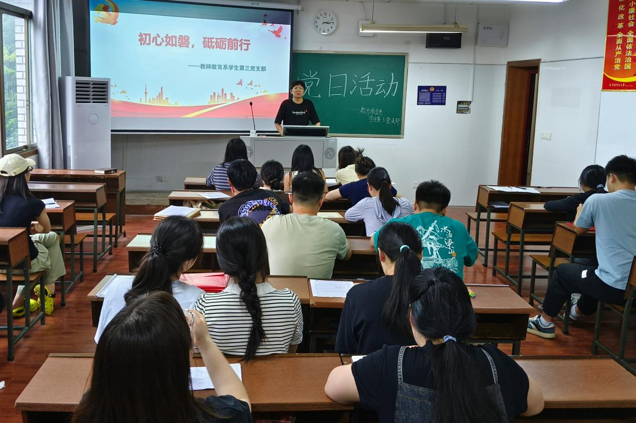 (记者 常雅欣 雷玉婷 唐念祖)6月18日下午,我院教师教育系学生第三党支部在达善楼212教室开展以“初心如磐,砥砺前行”为主题的党日活动。毕业生党员李涛、吕扬帆、王薇祺担任主讲人。