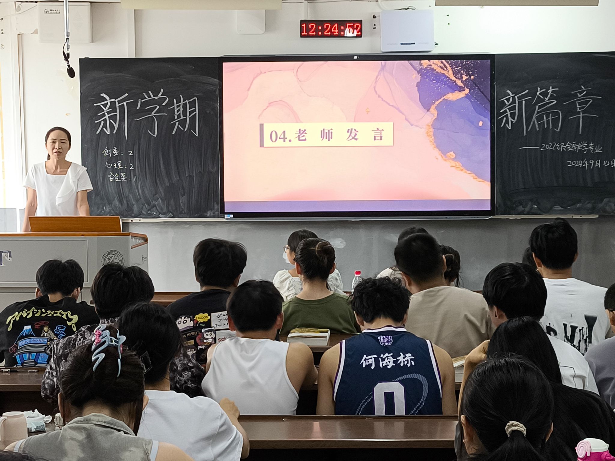 (通讯员 刘艺杰 何灵姿)9月14日中午,我院经管系2022级金融学专业在树达楼406教室召开以“新学期,新篇章”为主题的班会。经管系辅导员王贞出席会议。会议由班长何灵姿主持。