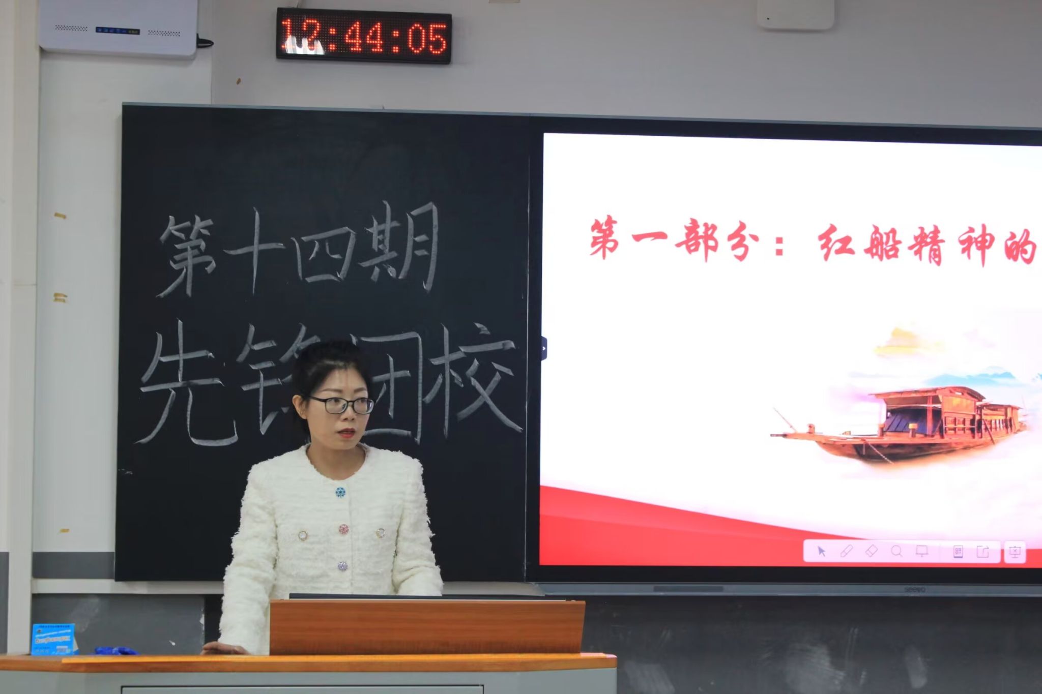 熊椰讲授了第一次理论培训课。她介绍了红船精神,详细讲解了红船精神中的首创精神、奋斗精神和奉献精神。她希望同学们可以传承红船精神,从深层次理解新时代学生干部的使命担当。