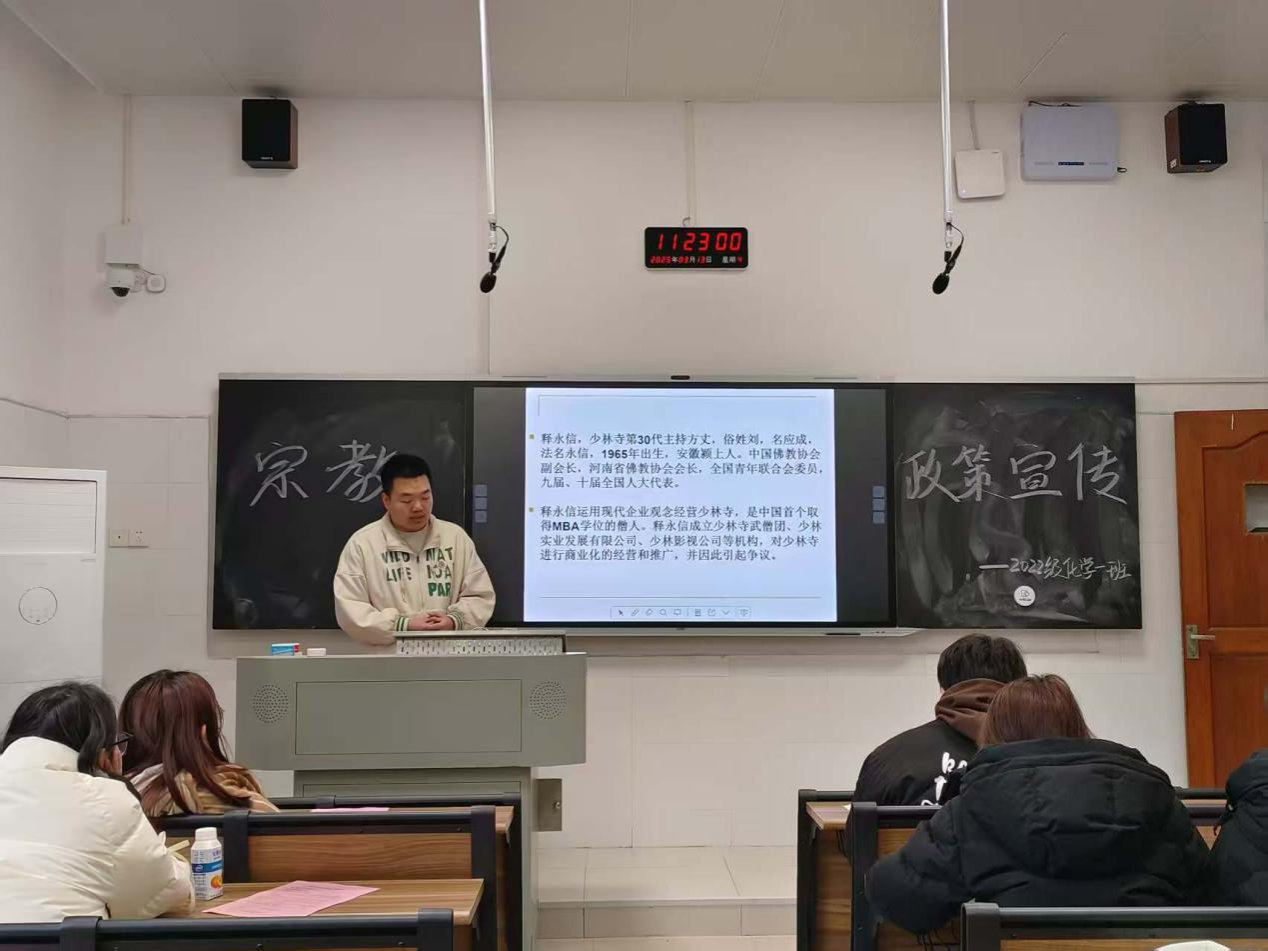2022级化学专业一班团支部副书记兼班长邓裕堃为每位同学分发了宗教政策法规宣传单。他表示,共青团员和共产党员必须严格遵守党的纪律,不得参与任何形式的宗教活动,要坚定不移地做马克思主义无神论者。人民群众有宗教信仰自由权,任何人应当尊重群众的宗教信仰。
