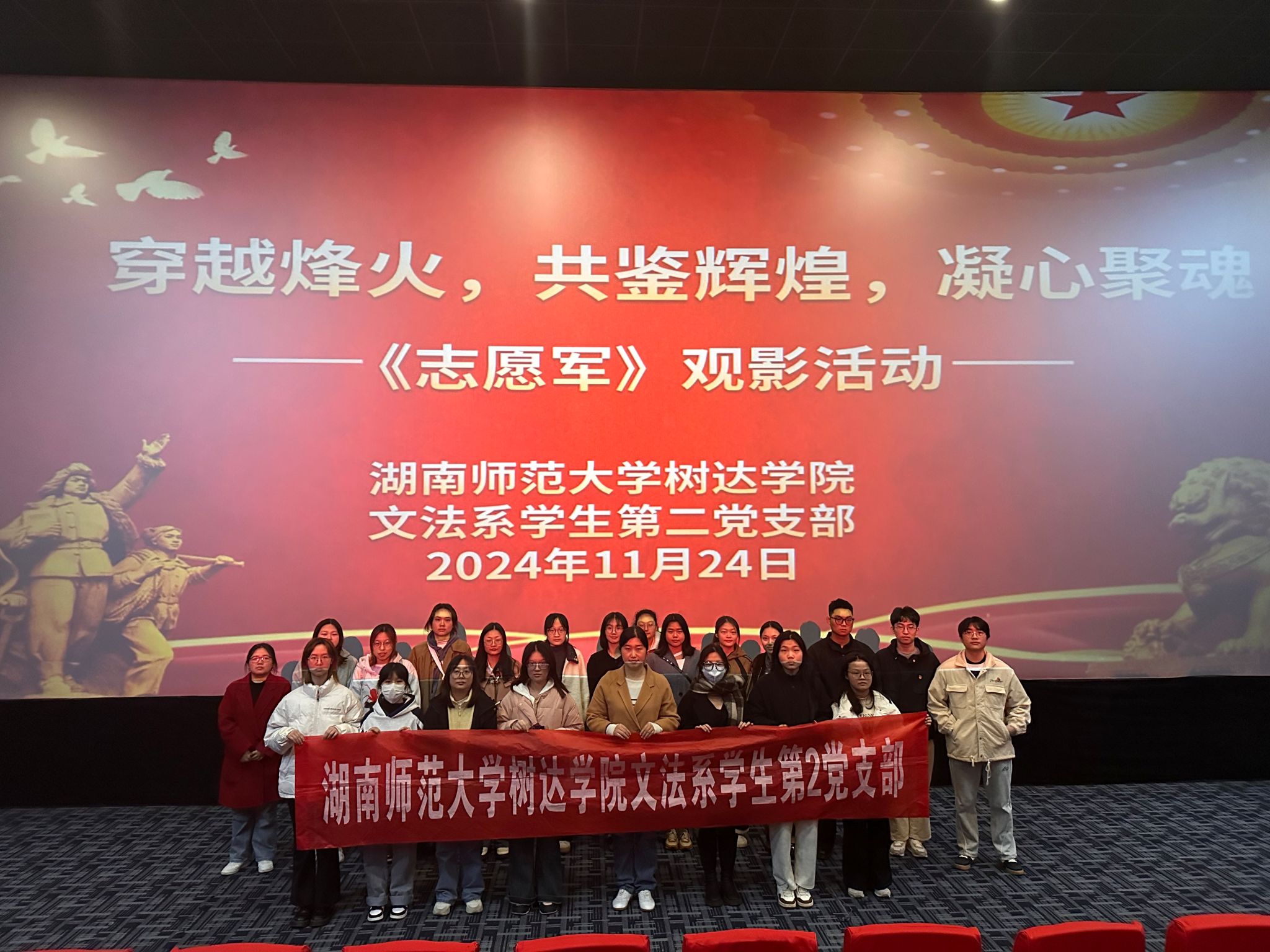 (通讯员 谭思 熊贝贝 黄雪琴)11月24日上午,我院文法系学生第二党支部在潇湘国际影城开展以“穿越烽火,共鉴辉煌,凝心聚魂”为主题的红色观影活动。文法系学生第二党支部第一书记彭娇出席活动,活动由文法系学生第二党支部成员谭思负责。