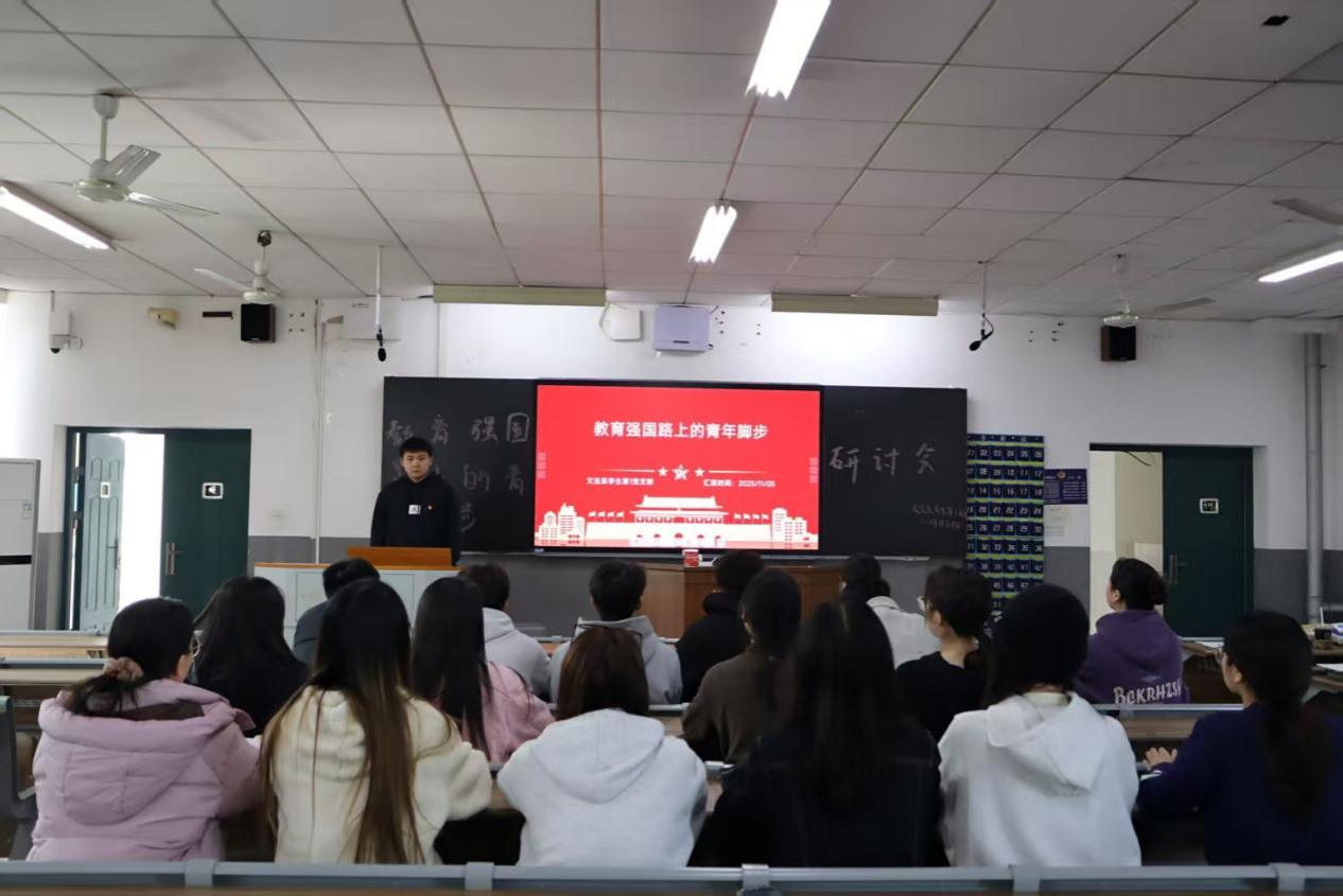 (通讯员 李曼)11月5日中午,我院文法系学生第一党支部在树达楼506教室开展以“教育强国路上的青年脚步”为主题的专题研讨会。会议由文法系学生第一党支部副书记肖逸航主持。